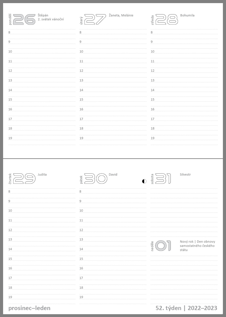 Ať už si zvolíte jakékoli období, které má váš diář pokrývat, vždy v kalendáriu najdete ještě o týden navíc před a týden navíc po.